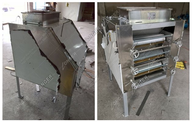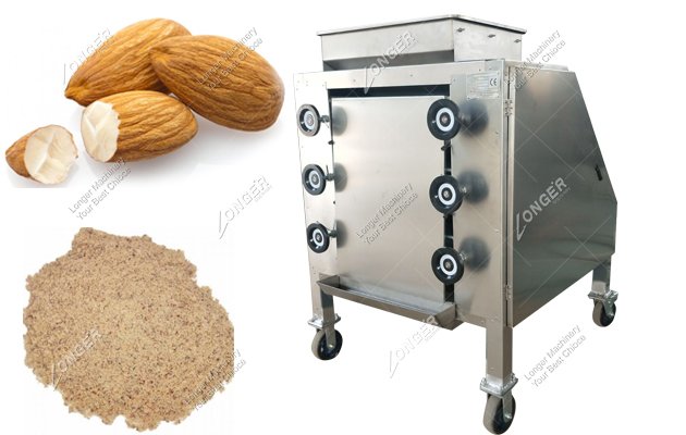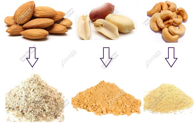 Nuts enter the rolling area from the feeder, powder is obtained by repeated extrusion between the roller and the roller, different milling fineness can be obtained by adjusting the distance between two rollers, the commercial nut flour mill has the advantages of easy operation, low noise and high yield, and is the ideal equipment for crushing oily materials.